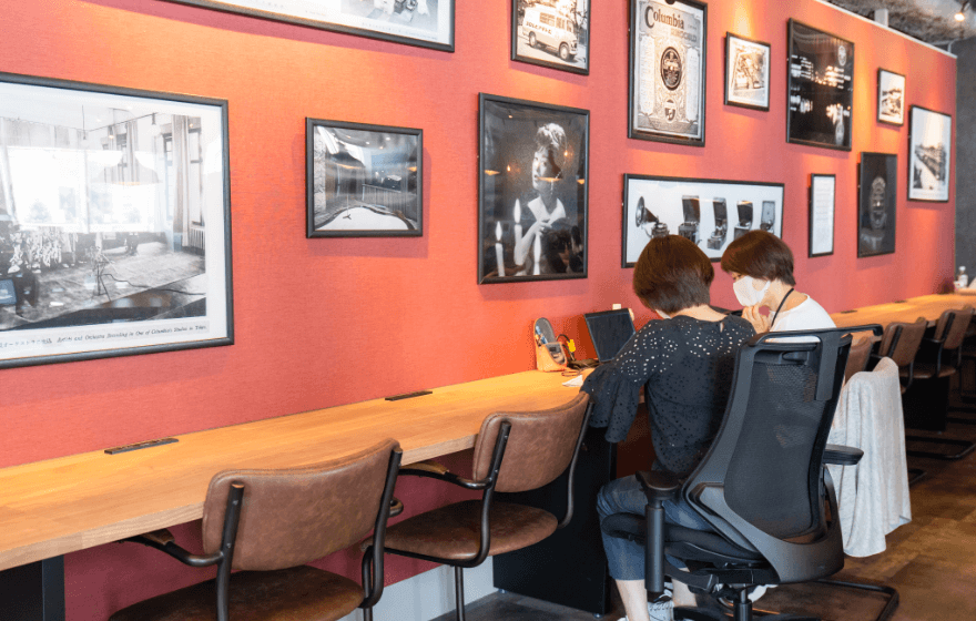 • 前面の壁面に日本コロムビアの創業からの歴史的瞬間を伝える写真等が展示されているローカウンター。後ろに長机があり、同じチームで近くに座り、業務の合間に意見を交わしたり進捗を確認しあったりする様子が見られます。